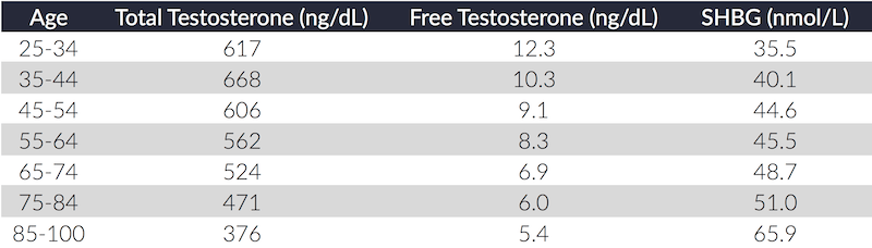 “In general, the normal range in males is about 270 to 1070 ng/dL with an average level of 679 ng/dL. A normal male testosterone level peaks at about age 20, and then it slowly declines.”