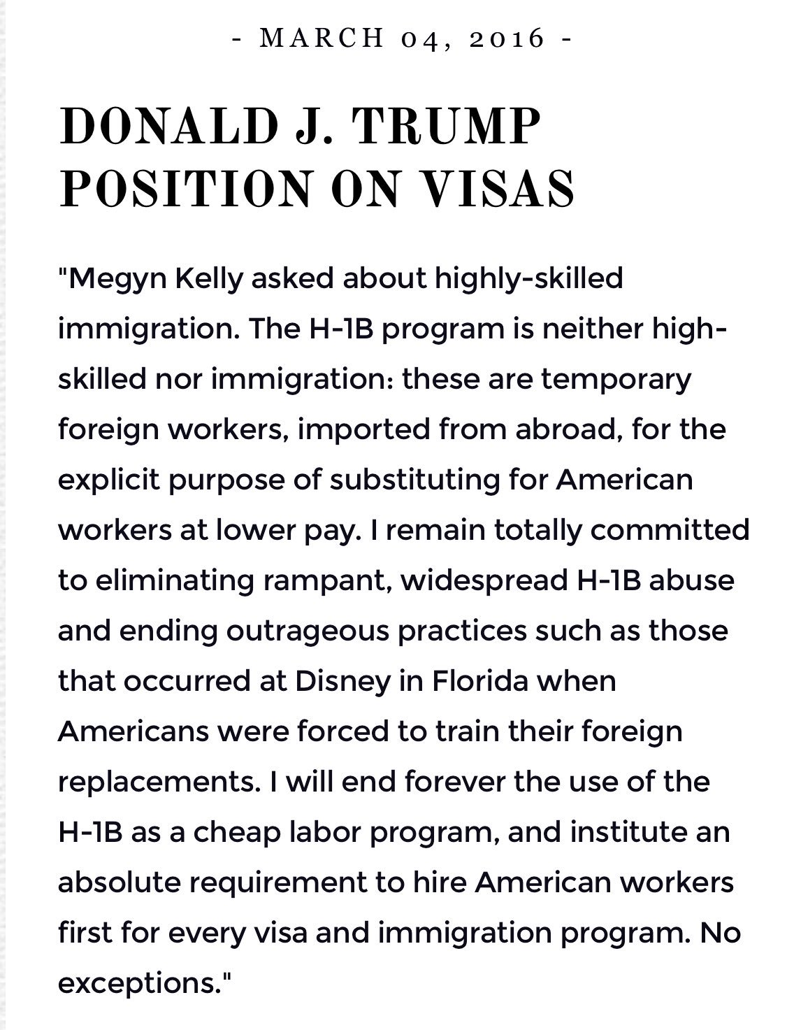 As for the H-1B. You HAVE to have foreign workers? Ok. We have 100,000 a year and companies bid a worker import tax and pay the US government. The money used for laid off workers. You want a foreign worker then you have to high bid on one of the slots. I bet they would rarely fill all bids.